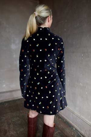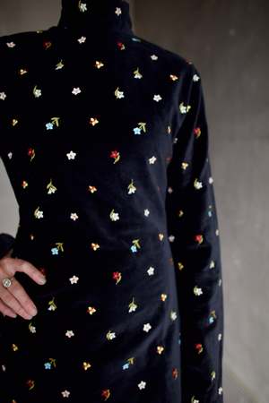 Experience timeless sophistication with the Romy Onyx Bouquet Dress by Alix Of Bohemia. Crafted with a shell of 100% premium cotton and a lining of 75% cotton and 25% silk, this dress features a refined mock neck and flared long sleeves for an elegant silhouette. The Black Onyx colorway offers versatile styling for both professional and social occasions. Made in India. Shell: 100% Premium Cotton Lining: 75% Cotton & 25% Silk Color: Black Onyx Origin: Made in India