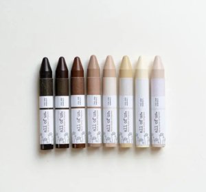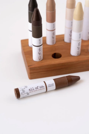 These skin tone crayons are richly pigmented to represent and celebrate the beauty of all skin tones. Each crayon is poured by hand to create a thick, round crayon that is easy for little hands to grasp. The round tip is incredibly versatile and well-suited to drawing face shapes, large portraits, and broad strokes. Sustainably sourced beeswax, plant waxes, and natural earth pigments. Non-toxic, no paraffin, no soy wax, no chemical fillers. Set of 8. Made in the States.