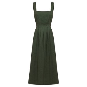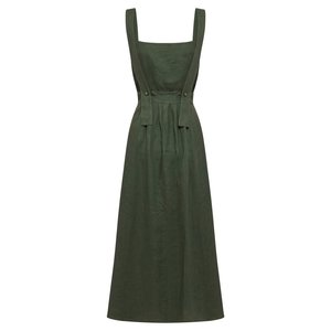 Striking linen pinafore dress with cross over back. Adjustable button closure straps. Flattering pleated skirt with wide sweep and side pockets. Lined. 100% linen