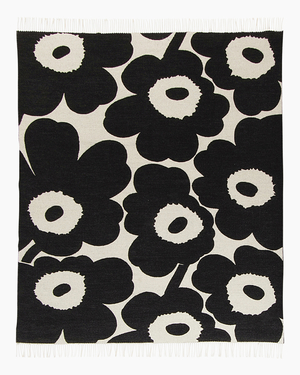 This beautiful wool and cotton mix blanket is covered with the white and light grey Unikko pattern. The blanket measures 130 x 180 cm and it has fringes at the ends. Marimekko's famous poppy pattern Unikko was born in 1964 in a time when the design house's collectsions featured mostly abstract prints. Designer Maija Isola wanted to create something interesting from this organic theme and designed an entire range of floral prints. Today, the iconic flower represents creativity. 130x 180 cm