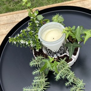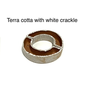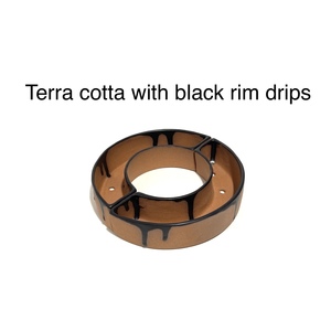 Stoneware, glazes 2 part planter to sit around patio table umbrella as centerpiece. 6.25" diameter, 3.5" open center, 1" tall Ideal for succulents, hens and chickens, small flowering annuals (you will need to snip bottom of root to fit;) Deliberately proportioned to allow room on table for food and drink, low enough to allow umbrella crank and growing flowers to not interfere with closing umbrella. This smaller version may be used on patio dining tables, but also ideal for side tables with room in center for citronella candles. Drainage holes on the bottom. Cannot be left outside in freezing temperatures. Made in Sebringville