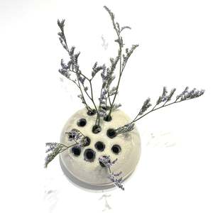 Wheel-thrown stoneware vessel with pierced lid. Add water, place the lid, and arrange flowers in the pierced lid. Dimensions: 4.5" x 3.5". Made in Sebringville, Ontario.