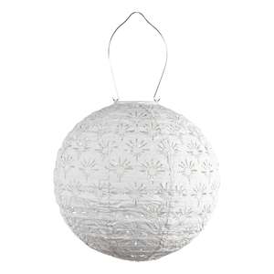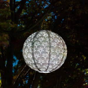 The Soji Stella Deco Globe is a 12-inch solar lantern that provides outdoor illumination. Its design features repeating geometric cutouts, reminiscent of 1920s Art Deco patterns, which cast decorative shadows when lit. The lantern is constructed from weather-resistant DuPont Tyvek, a durable material suitable for year-round outdoor use. Its lightweight construction and spherical shape allow for versatile placement, whether hung, set on a surface, or incorporated into garden pathways. The Stella Deco Globe is powered by an integrated solar panel that charges a rechargeable battery, providing light after dark. 12" H x 12" W dimensions provide a substantial decorative element. Weather-resistant DuPont Tyvek construction ensures durability in outdoor conditions. Integrated solar panel and rechargeable battery offer cordless, self-sufficient lighting. Automatic on/off functionality with a built-in photosensor simplifies operation.