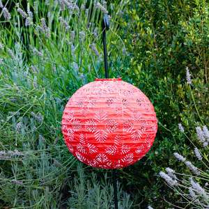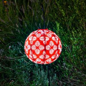 This set includes three Stella Solar Lanterns in limited edition Geo Palm patterns in Chili, Violet, and Clementine. Constructed from weather-resistant DuPont Tyvek, these lanterns are durable for year-round outdoor display. Each lantern features a solar panel that charges during daylight hours and an LED light that automatically illuminates at dusk. The lanterns are equipped with a rechargeable AAA battery and stainless steel hardware for hanging.