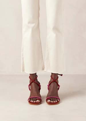 let these all-time favorite strappy sandals *grace* your summer wardrobe. featuring thin strings and crossover ankle ties, this pair is made in spain from red and pink suede leather. they sit on comfortable footbeds with 8 cm block heels. the grace sandals are 100% cow leather. this style runs true to size, and sizes shown are european. using a low-waste, on-demand model, ALOHAS footwear is ethically handmade in spain.