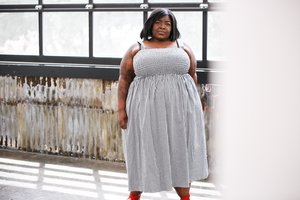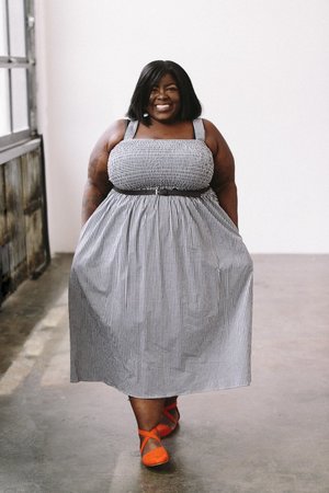 Doing a dress with smocking has always been a goal of ours because of the effortless and comfortable fit that it creates. This adorable midi-length gingham dress has smocking across the entire bust for a lovely fit, with a basted waistline and big, roomy pockets. Available size Small-6 XL Made from lightweight, deadstock cotton rayon blend.
