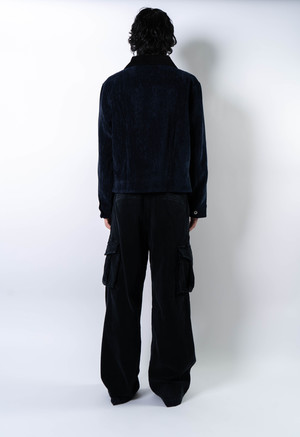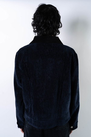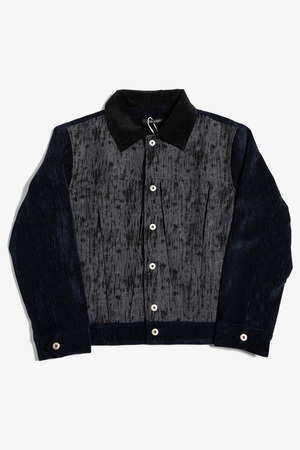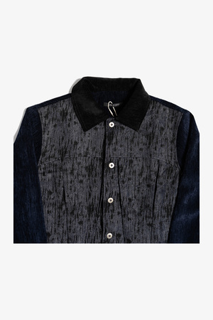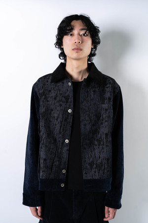 Constructed from a high-sheen, velvet-touch polyester base, paired with a denim-textured tie-dye panel across the front. The jacket presents a rich handfeel and elevated surface luster. A reinterpreted trucker silhouette, featuring four internal pleats for added depth and dimension. Cropped cut tailored to current styling trends. Main: 95% Polyester / 5% Spandex Contrast: 50% Viscose Rayon / 50% Polyester Made in China. Sizing - Regular fit. - Model is 6'0" / 145 lbs, wearing size M. S M L XL 1/2 Chest 58 60 62 64 Shoulder 47 49 51 53 Sleeve 63 64 65 66 Length 62 64 66 68 *Measurements are in cm. Manual measurement may result in a 12 cm margin of error.