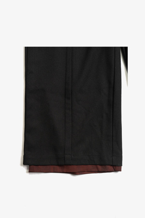 Wide-leg reversible pants constructed with a structured double-layer design. One side features black outer fabric with exposed red lining at the hem for contrast and depth. The reverse side reveals a textured reddish-brown finish with front slash pockets. Cut in an exaggerated A-line silhouette with added seam detailing to emphasize form. Each side uses a different fabric with distinct texture and weight. The double-layer build gives the garment a substantial, weighty feel. An adjustable elastic waistband provides flexibility in fit. Black side: 75% Polyester, 20% Rayon, 5% Spandex. Reddish-brown side: 96% Polyester, 4% Spandex. Made in China. Sizing - Runs small. We suggest going one size up from your usual size. - Model is 5'11" / 154 lbs, wearing size L. Size chart (cm) S / M / L / XL - 1/2 Waist: 35 / 37 / 39 - Outseam: 105 / 106 / 107 - Leg opening: 36 / 37 / 38 *Measurements are in centimeters. Manual measurement may result in a 12 cm margin of error.