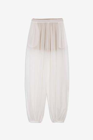 Balloon trousers in light, semi-transparent jersey fabric. Elastic waist with a built-in beige slip and side seam pockets. Made in Italy.