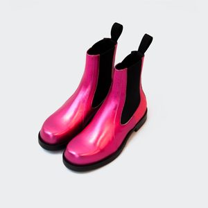 Refined pink metallic leather Chelsea style boot with a leather stack sole, round seamless front, thick black elastic side panels, black nylon strap cording pull tab. - DETAILS - 100% Leather upper, lining and sock. Man made outer sole - Made in Italy - MEASUREMENTS - Length: 10.5in / 26.5cm - Width: 4in / 10cm - Heel hight: 1in / 2.5cm - Boot hight: 6.5in / 16.5cm - Measurements taken from a size 38 - Founded by Matthew Williams, a former creative director for Lady Gaga & Kanye West, Alyx is a modern womenswear collectsion that finds inspiration in Williams' Southern California youth. A LVMH Prize Finalist in 2016, Alyx is unique in its approach to producing streetwear-influenced designer fashion. Williams' painstaking research into fabrics, construction and attention to even the smallest details (not to mention only working with the top ateliers in Italy) has created a serious attention around this young brand.