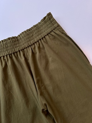Cropped barrel leg pant cut in lightweight crinkle cotton, featuring a comfortable elastic waist at back and clean front finish. Hidden side pockets. Relaxed fit w/ tapered leg. Inseam 25". 100% Cotton. Designed in Toronto, made in Montreal. Sits at at true waist.