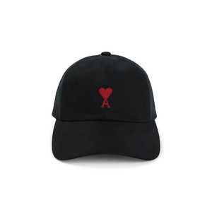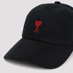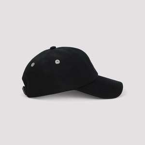 Men > Accessories > Hats Black cotton hat featuring a front red embroidered logo2, six-panel construction, silver-tone metal eyelets, and an adjustable back strap.