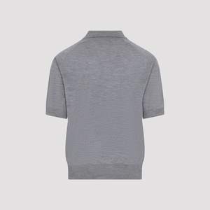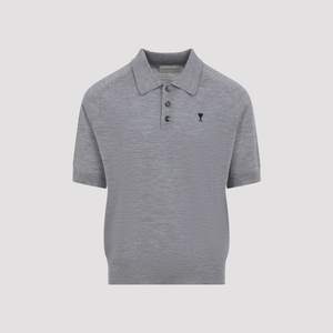 Men > Clothing > Topwear > Polo Shirts Ami Contrasted ADC grey merino wool polo. Knitted polo crafted from mlange grey merino wool, featuring a pointed collar, horn-button fastening on the front, a contrasting black logo2 embroidery on the chest, short raglan sleeves, and ribbed edges.