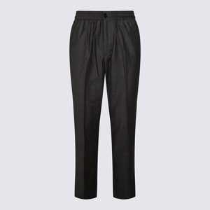 Grey wool pants featuring an elasticated waist, frontal zip and button fastening, and straight leg. Composition: 100% Wool.