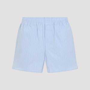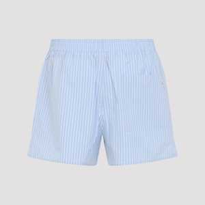 Men > Clothing > Pants > Shorts Ami elasticated light blue cotton shorts. Casual fit shorts crafted from light blue and white striped cotton poplin, featuring an elastic waist, a concealed zip fastening on the front, side pockets, a patch pocket with mini branded label on the back, side slits, and a straight hem.