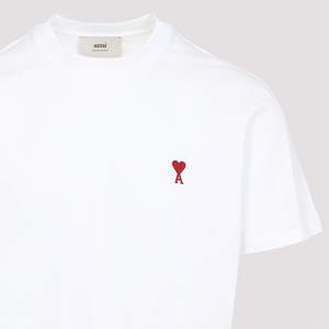 Men > Clothing > Topwear > T-Shirts Ami Alexandre Mattiussi classic red logo2 T-shirt in white cotton jersey. Features a round ribbed neckline, red contrasting embroidered logo2 on the chest, short sleeves, and a straight hem.