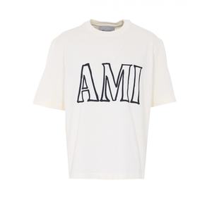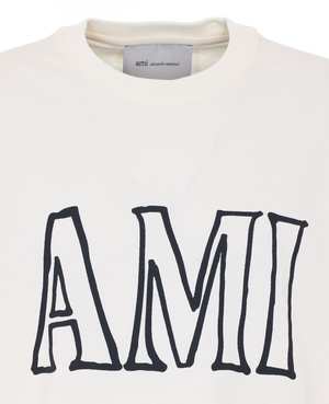 Men > Clothing > Topwear > T-Shirts Ami - Alexandre Mattiussi A white crewneck T-shirt featuring logo2 print on the front and back, with a lateral Ami De Coeur print on the short sleeve. Composition: 100% Cotton.