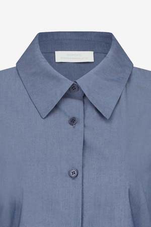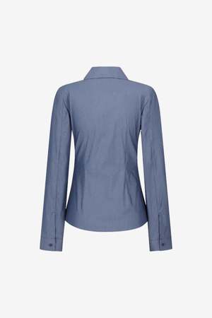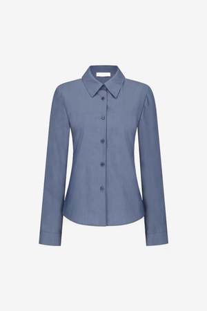 The Slim Shirt in Indigo by AMOMENTO is a women's apparel style from the SS26 pre-collectsion. Style code: AM26SSW04SH. Color: Indigo (filter color: Purple).