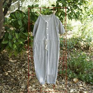 From Amore for Spring / Summer 2021. Kid's slouchy short sleeve jumpsuit in a medium gray. Waist can be cinched or worn untied for a looser fit. - Kid's one-piece romper - Lightweight 100% cotton - Color: Gray - Round neckline - Short sleeves - Dropped shoulders - Contrast buttons and drawstring - Curved front pockets - Tapered ankles