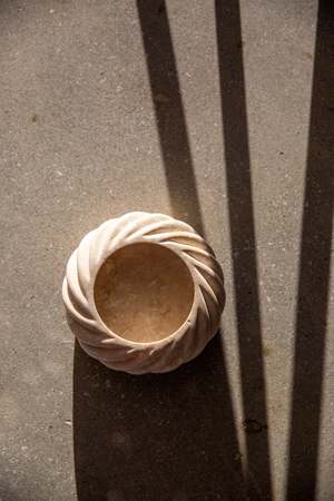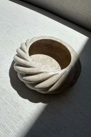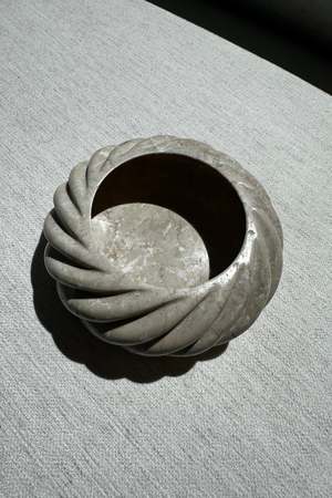 A limited production, functional object d'art exclusively produced by Anastasio Home. The Mini Cruller Bowl is a heavy set, six-inch round bowl cut from a single piece of solid stone, hand-finished in a twisted rope motif by artisans in a growing stone atelier in Rajasthan, India. Dimensions: 6Dia. x 3"H