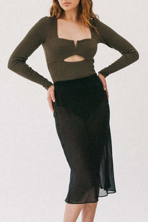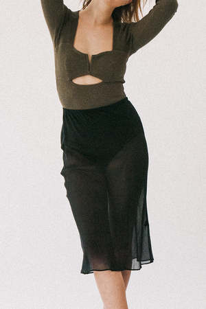Angie Bauer Carly sheer high rise silk-cotton bias cut midi skirt with an elastic waistband in black. 30% silk, 70% cotton. Eco-friendly. Mindfully made in Los Angeles. PIPE AND ROW