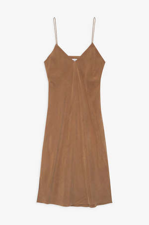 description: The Bay Dress is a timeless, midi-length slip in a neutral camel colourway with a subtle sheen, cut on the bias for effortless draping. Finished with an open slit at both side seams. fabric: 100% Cupro measurements: The Bay Dress is cut for a close-fit. Take your true size. Model is wearing a size S. Model Measurements: Height 5'10", Waist 23", Hips 34.5", Bust 31.5" Product Measurements (Size S): Length 36", Chest 34.5"