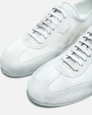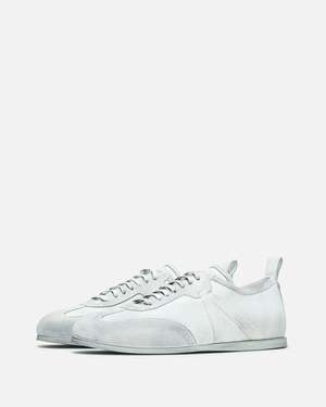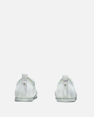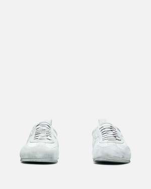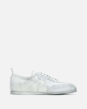 Ann Demeulemeester Siru Soft Low-Top Boxing Sneaker in Dirty Treated Canvas. These sneakers feature a lace-up closure, a distressed cotton upper with contrasting leather details, and a serrated rubber sole. Additional features include a padded tongue, grosgrain trim at the side, buffed leather lining, a signature rivet at the heel, and a leather pull tab at the heel.