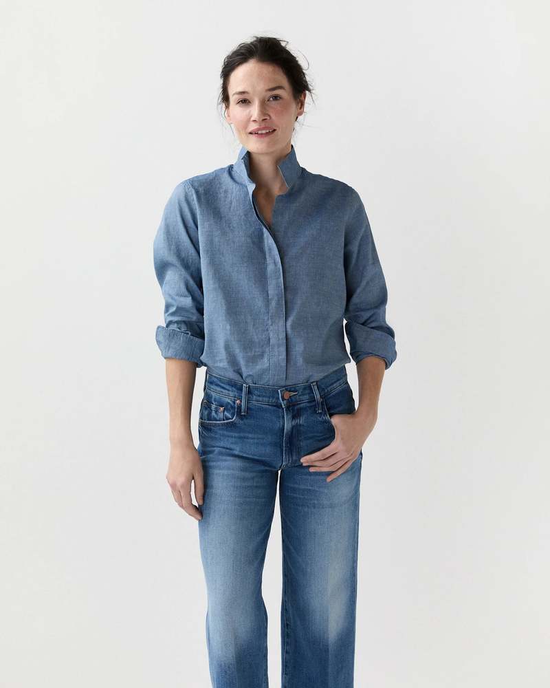 This shirt has an easy, relaxed fit through the body and is made up in a light washed Cotolino Chambray, but the real star is the collar. This stand collar delivers the right amount of face-framing impact without going full popped-collar-mode. A small touch that takes an outfit from good to fantastic, every time. - Cotolino Chambray: 51% Linen | 49% Cotton - 3.5mm Trocas shell buttons - French seams | covered placket | stand collar | curved hem | sleeve cuffs with placket - Machine wash cold, hang dry, medium iron, do not bleach.