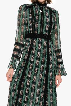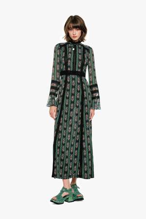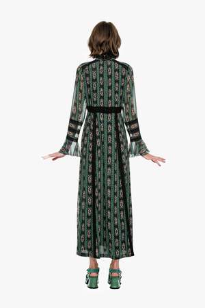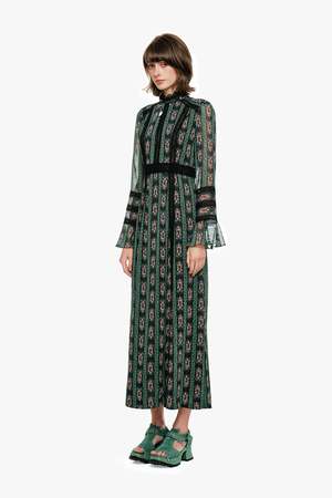 The Cameo Stripe Print Maxi Dress embodies graceful sophistication with a touch of gothic romance. Designed with a high, lace-trimmed neckline and long, airy sleeves, this silhouette blends elegance with effortless wearability. Delicate black lace contrasts beautifully against the Cameo Stripe Print, enhancing the dresss romantic charm. The empire waist flows into a sweeping maxi-length skirt, creating a soft, feminine drape with every step. Finished with an invisible center-back zipper, this piece offers easy wear while maintaining its refined, ethereal look. Fabric: 100% Polyester Hydrocarbon Dry Clean Only Made with love in NYC Style #1126A71 US size 2 shown in picture.