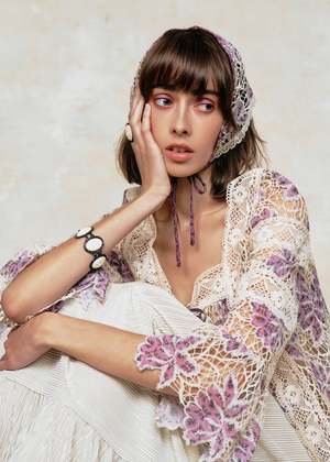 Elevate your look with the Medallion Floral Lace Headscarf, featuring delicate floral lace in a timeless medallion pattern. Lightweight and effortlessly chic, it can be styled as a headwrap, neck scarf, or accessory to add a touch of vintage-inspired elegance. A whimsical, versatile piece that embodies Anna Suis signature romantic and eclectic style. - Color: Mauve/Cream - Fabric: 100% Polyester - Care: Hydrocarbon dry clean only - Made in NYC - Style #1226B91 Size and Fit - US size O/S shown in picture.