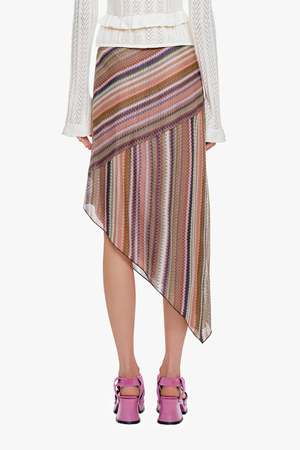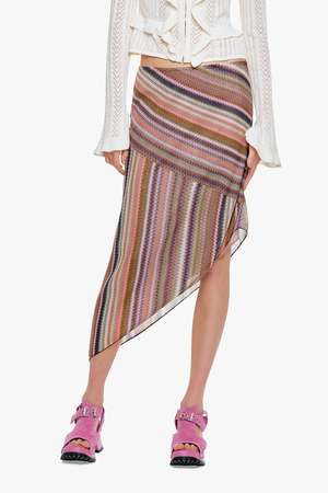 The Wavy Chevron Knit Asymmetrical Stripe Skirt by Anna Sui features a textured chevron knit with bold, directional stripes for a dynamic, eye-catching look. Its asymmetrical hem adds movement and a modern edge, while the soft, stretchy fabric ensures an effortless fit. A standout piece that brings artistic flair to any outfit. - Color: Mauve Multi - Fabric: 100% Viscose - Care: Hydrocarbon dry clean only - Made in NYC - Style #1226A12 SIZE AND FIT - US size S shown in picture