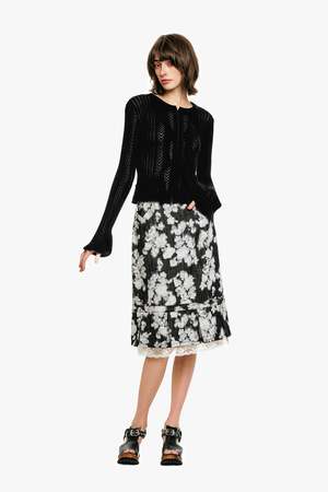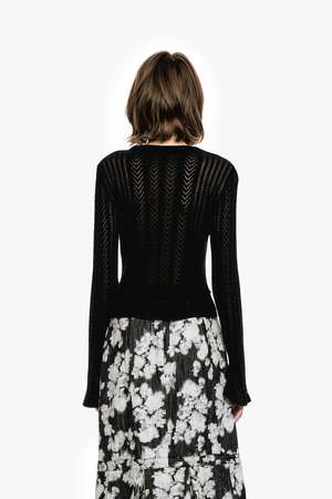 Please note this item is currently available for pre-order and is scheduled to ship mid-December. The Victorian Pointelle Knitwear Cardigan brings romantic vintage charm to your everyday wardrobe. Crafted from 100% cotton, this soft knit features a delicate pointelle design with charming ruffle details for a feminine touch. Finished with a hook-and-eye front closure, this lightweight cardigan layers beautifully over dresses or tops for an effortless, elegant look. - Fabric: 100% Cotton - Hydrocarbon Dry Clean Only - Made with love in China - Style #1226J30 SIZE AND FIT - US size P/S shown in picture