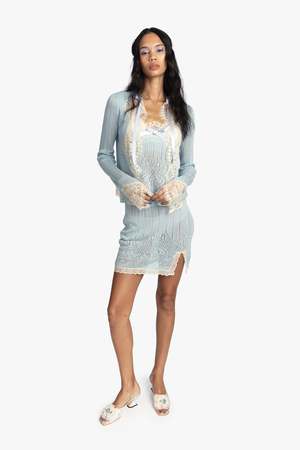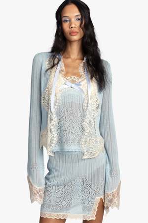 Soft, feminine, and effortlessly chic, the Lingerie Lace Knit Cardigan is the perfect layering piece. Crafted from stretchy, lightweight knit, it drapes beautifully over the body while providing comfortable ease. Delicate lace trims add a romantic touch along the edges and sleeves, complementing the matching camisole and skirt for a polished, coordinated look. Ideal for layering over dresses, tops, or the matching set, this cardigan brings understated elegance to any outfit. - Color: Sky Blue - Fabric: 61% Lyocell, 26% Acrylic, 13% Nylon - Care: Hydrocarbon dry clean only - Made in China - Style #226N30 SIZE AND FIT - US size P/S shown in picture