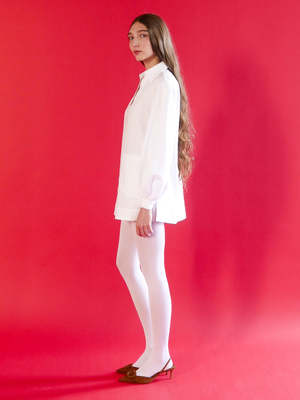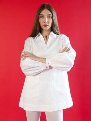 The Esme Tunic Top is crafted from a structured yet soft and breathable jacquard cotton fabric. Featuring a relaxed silhouette, a sharp collar, deep V-neckline, and functional front pockets. For a chic look, pair it with our Vivienne Flare Pant. Details: - Two front patch pockets - Balloon sleeves with buttoned cuffs - Pink mother of pearl buttons - Made in NYC Runs true to size. Lillian is wearing size XS. She is 5.95 ft (181cm). Her bust is 33.5" (85cm), waist is 24.5"(62cm) and hips are 34"(86cm).