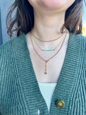 The Centre Amazonite Necklace by Anne Sportun features natural amazonite beads centered on a delicate 18K yellow gold chain. Handcrafted in Toronto, Canada, this fine jewelry piece offers tranquil elegance with its distinctive turquoise-green amazonite and refined gold detailing. The necklace measures 16 inches in length and secures with a spring clasp closure. Professional jewelry cleaning is recommended for gold elements; amazonite beads should be gently cleaned to preserve their natural beauty.