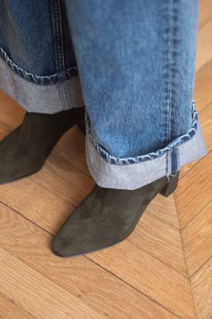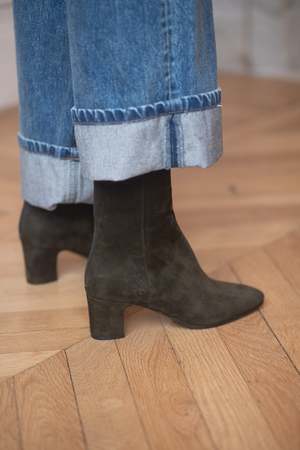 This Anita boot by Anne Thomas is available for pre-order, with delivery expected at the end of January 2026. Made from dark green velours (suede) leather sourced from high-quality Italian tanneries, this style features a chestnut-brown leather lining, leather sole, and a 5 cm heel. Each pair is handmade in the Aveiro district of Portugal. Fit: Fits true to size. Please select your normal size. Pre-order: Same return and exchange conditions as a standard purchase.