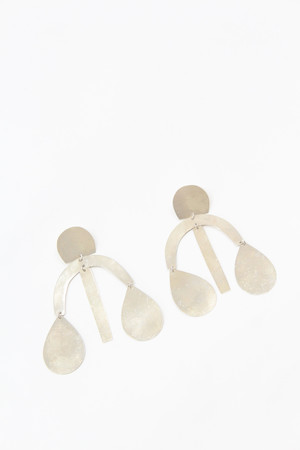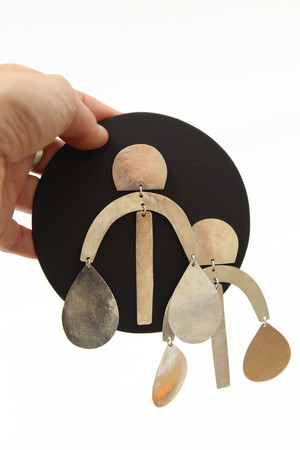 Hand-cut hammered shapes, burnished silver finish, approximately 4" tall x 3.25" wide. Very light and comfortable to wear. Handmade in Los Angeles
