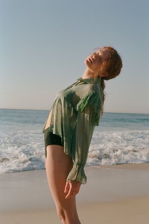 A sheer statement shirt in iridescent silk chiffon, featuring dropped shoulder seam ruffles, billowing sleeves with drawstring cuffs and buttons front. This fabric is light as a feather, drapes beautifully and changes colour as it catches the light. Made with love in Redfern, Sydney from 100% deadstock silk chiffon. Designed and made to last. Deadstock refers to fabric leftover from larger-scale designers that is sold on when the previous designer is no longer producing those garments. By sourcing this leftover fabric, I am bypassing the traditional textile manufacturing supply chain - using up what already exists rather than ordering brand new fabric to be produced. It is the 'one man's trash' of the fashion supply chain. This means that each fabric has a limited quantity - sometimes only enough to make a couple of shirts. As a small independent label, this allows me to create limited runs of pieces in beautiful, sustainably-sourced fabrics that would otherwise potentially end up in landfill. Care instructions: Please take special care of this garment to ensure long life. Dry-clean only.