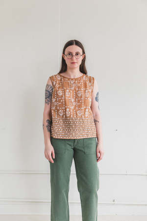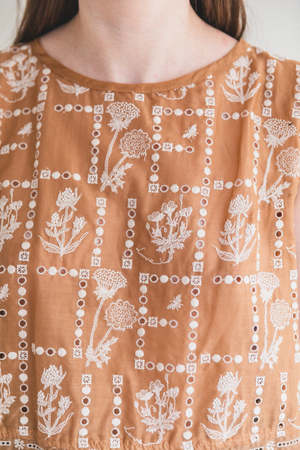 A pullover A-line tank that has been garment dyed with detailed embroidery throughout. Features a crew neckline, an inverted pleat at the back and comes with a cotton cord belt. Launched in 1991 by Japanese textile designers Junko Jinushi and Kyoto Kato, Anitpast is a range of colorful, textured everyday pieces designed, as the label's name suggests, to excite the wearer's appetite for forward-thinking design. Best known for their creative socks, they also design interesting textile based apparel. - 95% cotton, 5% linen. - Dry clean only. - Made in Japan.