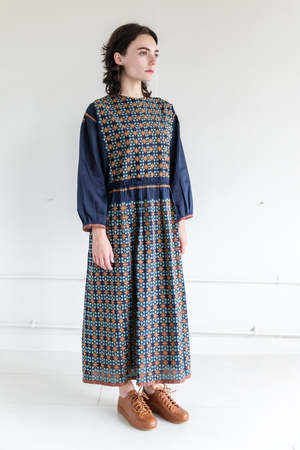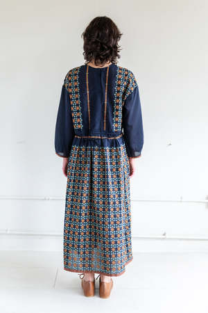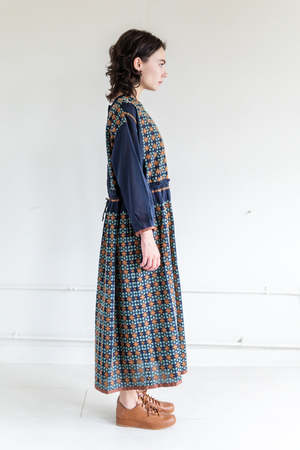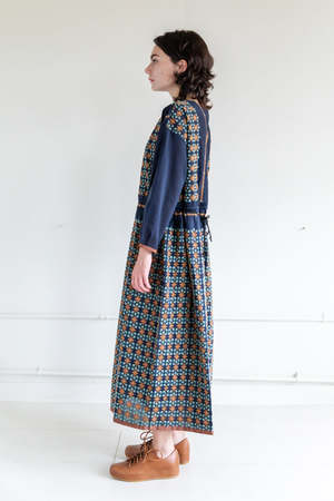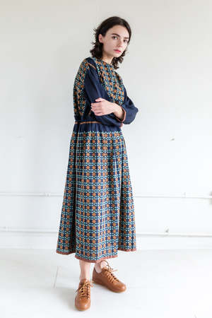 A long sleeve dress with a crewneck, snaps in the back, drawstring belt, gathered skirt and an embroidery pattern throughout. Launched in 1991 by Japanese textile designers Junko Jinushi and Kyoto Kato, Anitpast is a range of colorful, textured everyday pieces designed, as the label's name suggests, to excite the wearer's appetite for forward-thinking design. Best known for their creative socks, they also design interesting textile based apparel. - 70% cotton, 30% silk. Embroidery thread 71% cotton 29% polyester. - Dry clean. - Made in Japan.
