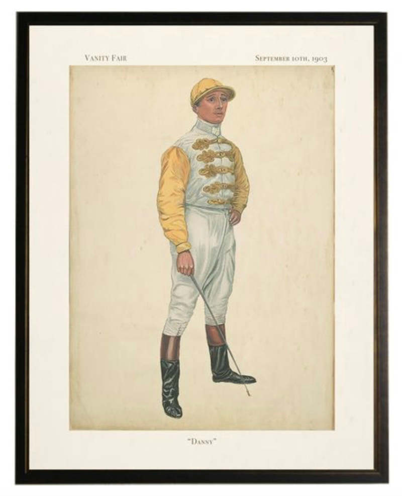 This vintage-inspired print features a posing jockey in yellow and white apparel, framed in a copper and black wooden frame. The piece measures 16 inches by 20 inches. Made in USA with real wood, hangs from back-mounted hardware, and is encased in glass.