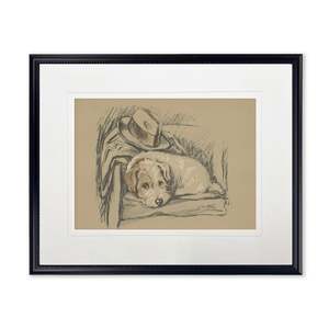 This print features a lounging dog next to a hat, framed in a black wooden frame. Sized at 20 inches by 16 inches. Made in USA with real wood and encased in glass. Hangs from back-mounted hardware.