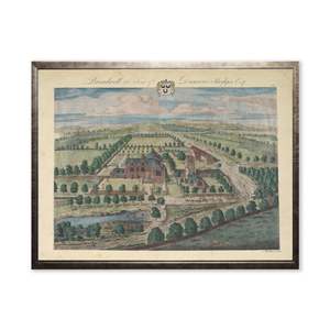This vintage-inspired print features an antique painted estate plan, framed in a silver wooden frame. Sized at 18 inches by 24 inches. Made in USA with real wood and encased in glass. Hangs from back-mounted hardware.