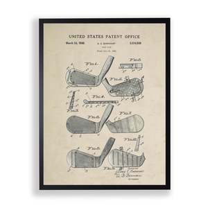 This print features a patent illustration of three golf clubs, framed in a black wooden frame. Sized at 16 inches by 20 inches, it makes a beautiful addition to any wall. Made in the USA with real wood, hangs from back-mounted hardware, and is encased in glass.