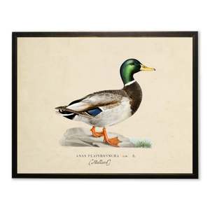 This vintage-inspired print features a mallard and is framed in a copper and black wooden frame. Sized at 20 inches by 16 inches, it makes a beautiful addition to any wall. Made in USA with real wood. Hangs from back-mounted hardware and is encased in glass.