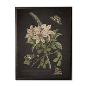 This print features a sherardia bouquet with two butterflies, framed in a copper and black wooden frame. Sized at 16 inches by 20 inches, it is made in the USA with real wood and encased in glass. Hangs from back-mounted hardware.