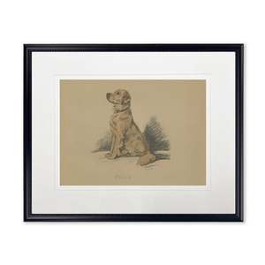 This print, framed in a black wooden frame, features a sitting dog. Sized at 16 inches by 20 inches, it makes for a beautiful addition to any wall. Made in USA. Made with real wood and encased in glass. Hangs from back-mounted hardware.