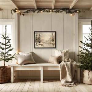 This vintage-inspired print, framed in a black, gold-beaded wooden frame, features a vintage oil painting of a snowy river scene. Sized at 21 inches by 17 inches, this frame makes for a beautiful addition to any wall. Made in USA. Made with real wood. Hangs from back-mounted hardware. Encased in glass.