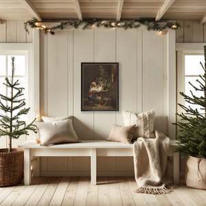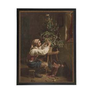 This reproduction print features an oil painting of a Christmas scene, framed in a black, gold-beaded wooden frame. The frame measures 17 inches by 21 inches and is made in the USA from real wood. The artwork is encased in glass and hangs from back-mounted hardware.