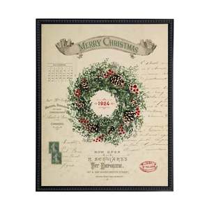 This vintage-inspired print features a painting of a wreath on a distressed bookplate background. It is framed in a black-beaded wooden frame and sized at 19 inches by 25 inches, making it a beautiful addition to any wall. Made in USA. Details: - Made with real wood - Encased in glass - Hangs from back-mounted hardware